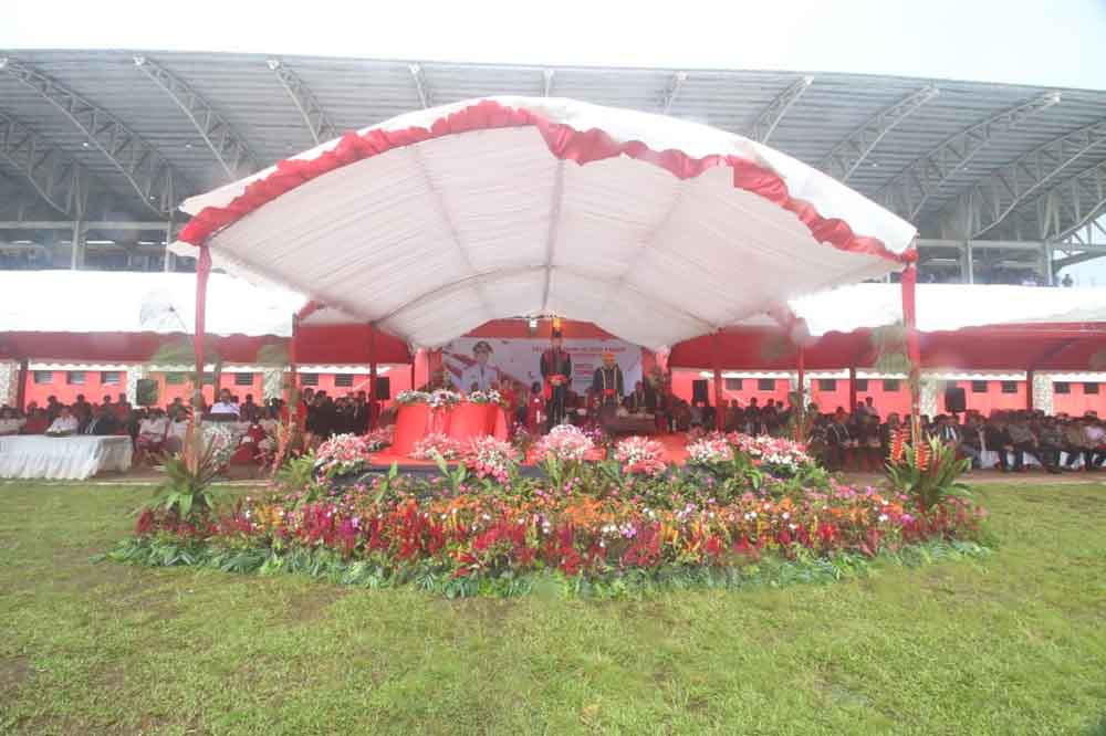 Tomohon -Upacara Peringatan Hari Jadi Ke-21 Kota Tomohon, berlangsung di Stadion Babe Palar Kota Tomohon, Sabtu (27/01/2024).
